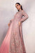 This is a luxurious blush pink bridal ensemble featuring intricate silver embroidery, delicate beadwork, and shimmering embellishments. The outfit includes a heavily adorned long jacket with sheer sleeves and a fitted bodice, layered over a voluminous lehenga skirt with subtle sequin detailing. It is paired with a matching embellished dupatta, adding elegance and grace. Perfect for weddings and grand celebrations, this outfit exudes sophistication and timeless charm.