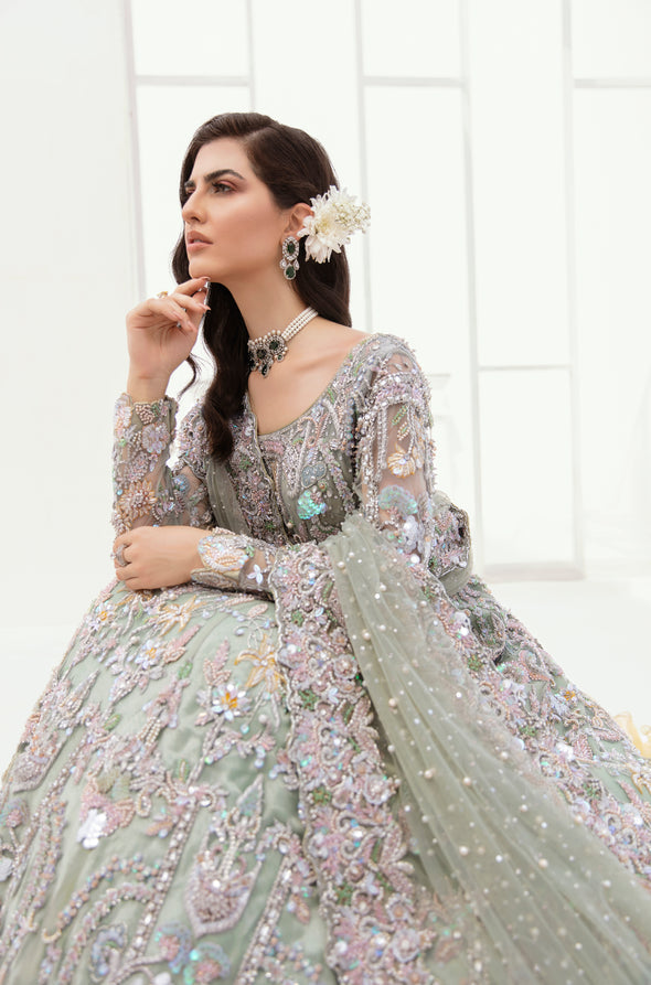 Orchid radiates the charm of a harmonious color palette with the artistic blend of accents of rose pink, dull yellow, and heavy detailing of sequenced handwork on a sheer pistachio green canvas.