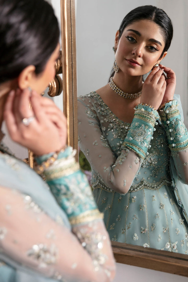 Exquisitely fashioned, 'Mirzeta' is an inspiring masterpiece, a canvas adorned with the artistry of seafoam, sage, and laguna hues, meticulously etched in intricate embroidery that graces every inch of the dress. The sheer fabric cascades gracefully to exude timeless and graceful femininity, complemented by a cinched waist. The ensemble is completed with an embelished organza dupatta and a peeking lehenga, elevating it to instant classic status with its timeless allure.